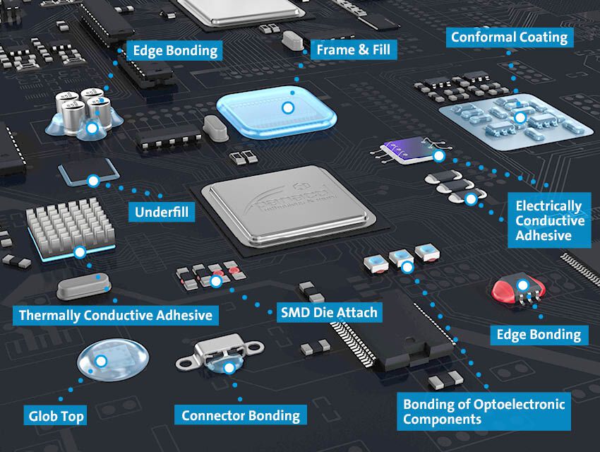 Panacol-USA offers adhesives for a wide selection of applications on PCB boards and electronic components (click to zoom)